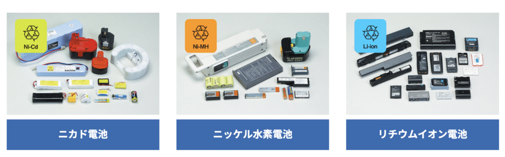 充電式の小型二次電池(リチウムイオン電池/ニッケル水素電池 /ニカド電池)やそれを含む製品は可燃・資源を問わずごみの収集には出せません。
