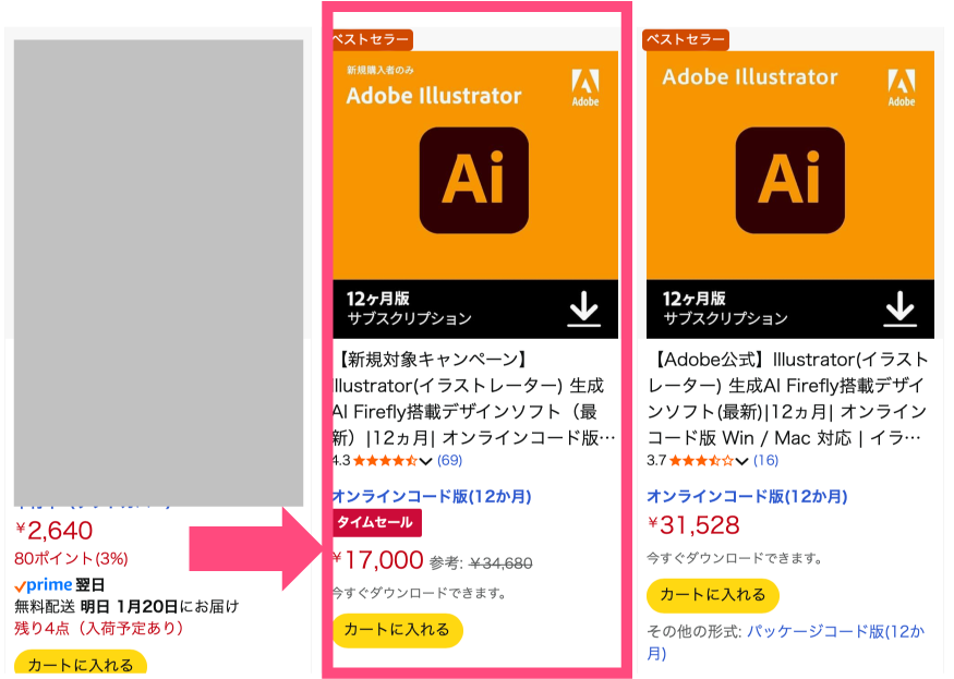 | Illustrator(単体) | ・Adobe公式サイト:3,280円 ・Amazon:なし | ・Adobe公式サイト:34,680円 …A ・Amazon:31,528円 …B |