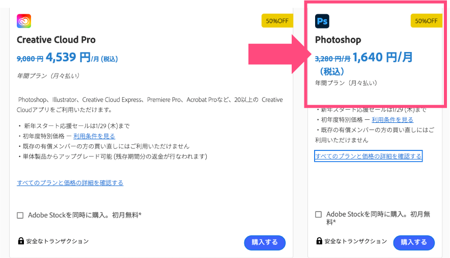 例えば、通常であれば「Photoshop単体プラン」よりも「フォトプラン」の方が安いですが、セール時期には逆転する場合もあります。