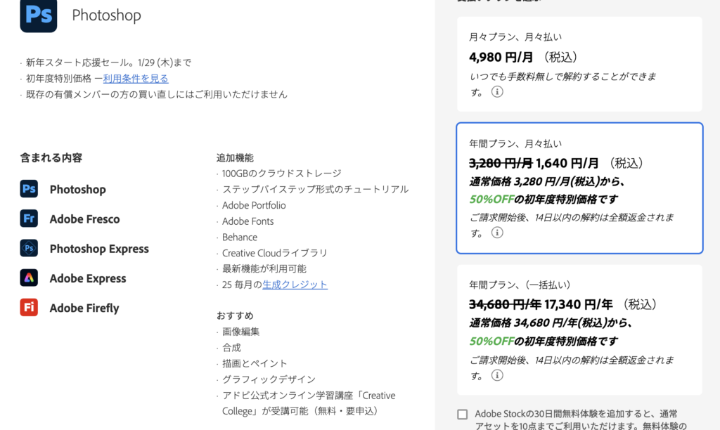 <Adobe新規ユーザーはこちら!>Adobe新規ユーザーならAmazon経由のフォトプランでなく、photoshop単体プラン(50%割引セール中)を公式から契約した方が安いです!